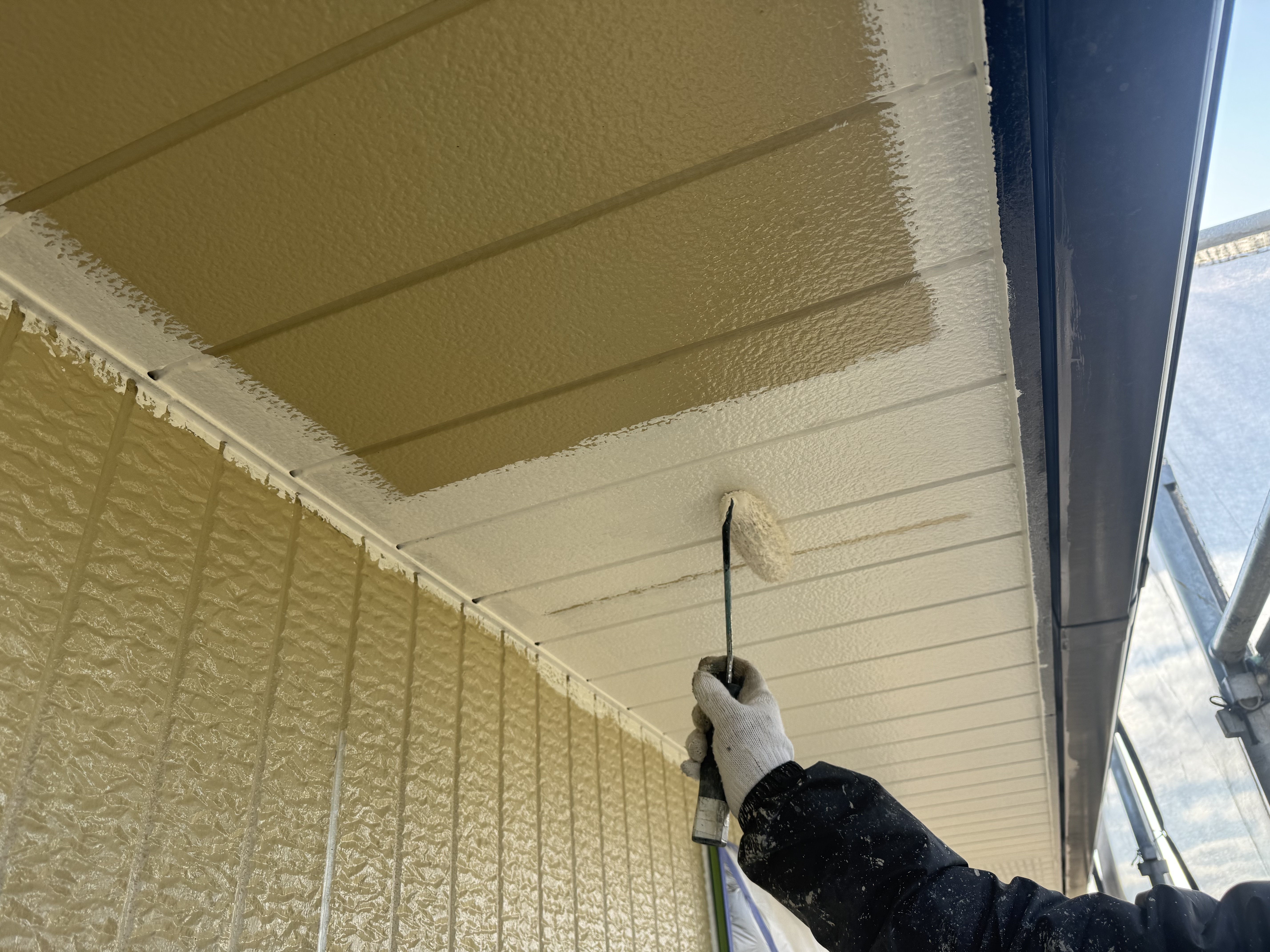 軒天は湿気が滞留しやすい場所ですので、防カビ性・透湿性に優れた日本ペイントのケンエースを使用しています。