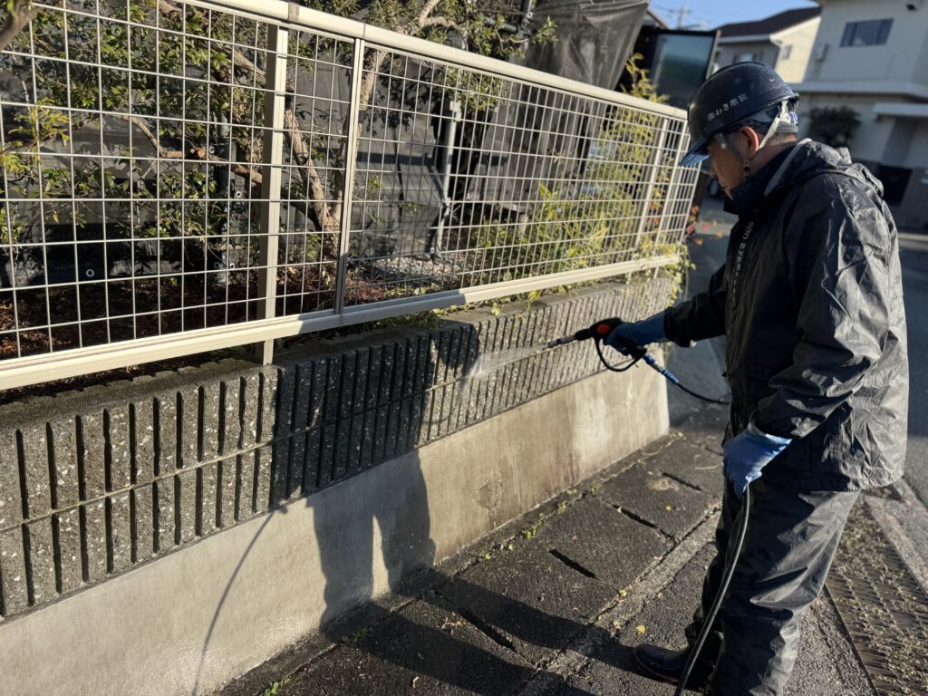 最後に、ブロック塀や土間コンクリートも洗います!