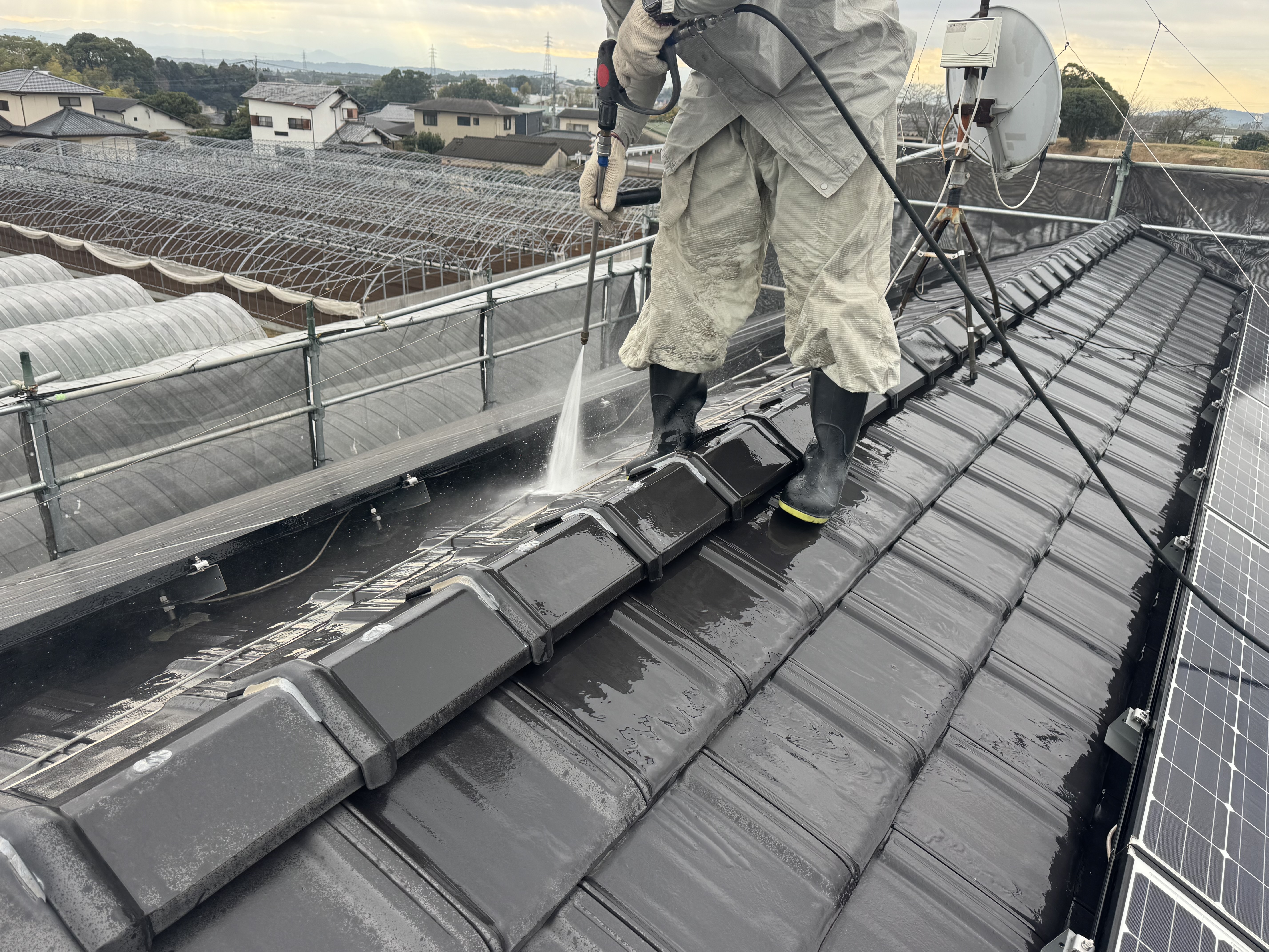 屋根や外壁もコケ等の汚れを念入りに洗い落とします。