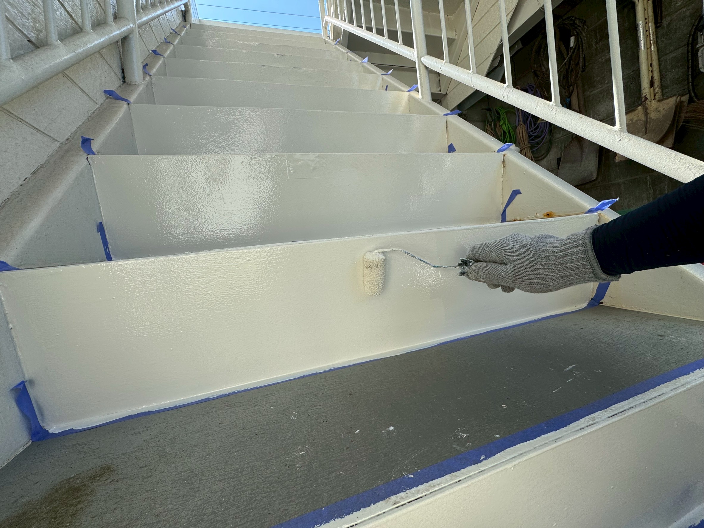 階段の裏側や手すりとの境目など、細かい部分までしっかり養生し、均一に塗装しました。